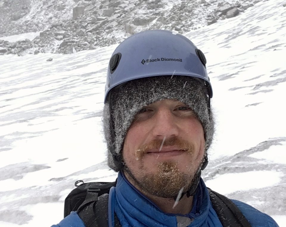 We lost the trail quickly above the bench: it was snow covered and wound its way through an alpine bog that had turned to a thicket of ice traps waiting to drench our socks. We picked a steeper but more reliable passage up a large boulder field. Pausing each time we pulled over another large block to look at the canyon walls, we discovered that the color had changed completely again. Every subtle change in angle of the sun caught a new facet of the landscape, reflecting pink, then purple, then orange, then yellow, then a brilliant gold, and then pink again, off the icy rock faces, snow-dusted scree fields, umber and siena scrub brush, and of course, the heavy storm cloud hanging over the summits to our west.