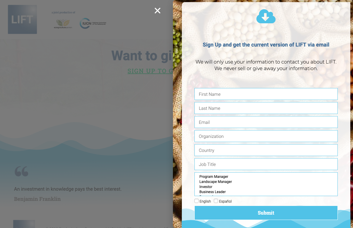 Our partner organization IUCN Netherlands commissioned me, through EcoAgriculture Partners, to develop a new website to drive signups/downloads of our Landscape Investment and Finance Toolkit (LIFT) and provide access to newly produced training resources for LIFT users.
