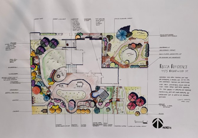 My final design brought the conceptual Meander into place on the site, while providing a fire pit, expanded pond with pergola, reduced (but not eliminated) lawn, expanded and more accessible terraced vegetable gardens, two “micro-orchards” for the permaculture-passionate client to experiment with fruit tree guilds, and several themed micro-gardens for clustered perennials. Lots of seating options and site lines allow the client grandma to keep at least one eye on her young grandchildren. The outdoor kitchen is designed to build off of and protect an existing cob oven, while adding dimension, storage and safety. Continue reading Permaculture Design: Recca Residence